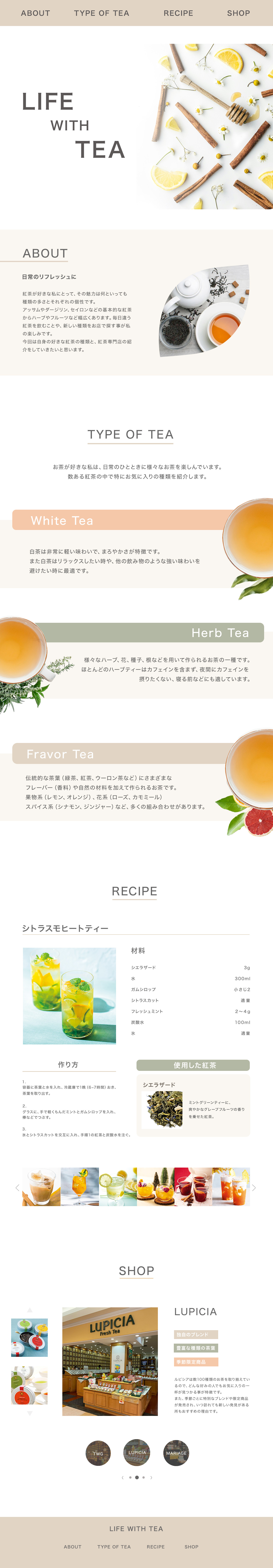 さらに、紅茶に興味を持ってもらえるようアレンジレシピを紹介し、ワクワク感を演出するために明るめの写真を多く配置。店内の写真も掲載し、雰囲気やディスプレイが伝わるよう工夫しました。